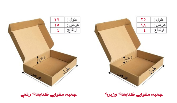 جعبه ها برای سایز رقعی 21.5*145 با عمق 4 سانتیمتر و سایز وزیری 17**24 با عمق 4 سانتیمتر قابل سفارش است همچنین میتوانید روی جعبه ها چاپ و یا لیبل نیز سفارش دهید